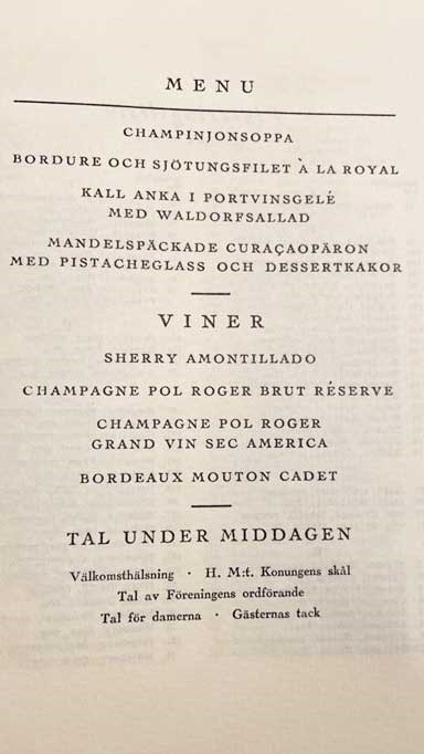 Till detta bjöds drycker av ädla slag, men om det fanns vegetariska alternativ eller alkhoholfria viner framgår inte av menyn.